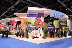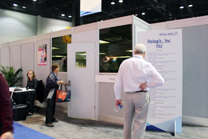 米国内において乳腺,骨密度計測,MRコイル,細胞診などの分野で事業を展開しているHologic, Inc(ホロジック)は,ブレストデジタルトモシンセシスを搭載した乳房X線撮影装置「Selenia Dimensions」を中心に,Woman's Healthcareを前面に出した展示を行った(Booth 1135,1035)。ブース内にはSelenia Dimensionsを数多く配置し,観葉植物や花で飾るなど,女性をイメージした柔らかな雰囲気で来場者を迎えている。