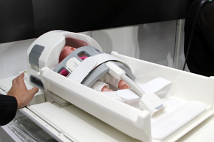 また,同コーナーでは,新しい小児(乳幼児)向けの頭頸部用16chコイルを展示した。ベッドとなる専用の保育器のままコイルにセットできるため,患者を起こさずにセットでき,コイルセンターにセッティングできることで,高画質撮影が可能になる。この専用コイルと静音機構の組み合わせで,小児に優しいMRI検査が可能になることをアピールした。