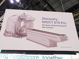 GE HealthcareのMIコーナーでは,SPECT/CT「Discovery NM/CT 670」とPET/CT「Discovery IQ」のパネル展示を行い,最新のアプリケーションなどを紹介した。