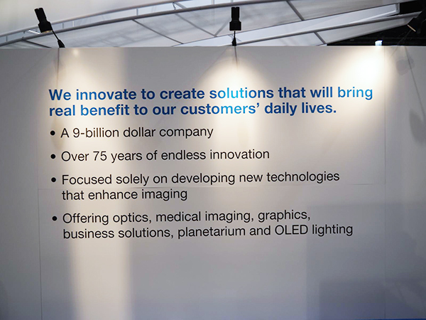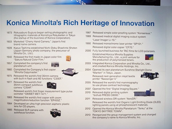 ブースでは,パネルや外壁を使ってヘルスケア分野以外も含めたコニカミノルタの概要を説明。100回目のRSNAにちなんで,1873年の創業以来約140年,コピー機やカメラなど同社が手がけてきた数々のイノベーションを年表にまとめて紹介していた。