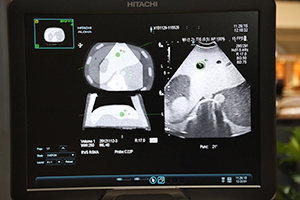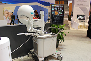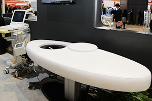 また,自社開発製品単体での展開だけでなく,市場ニーズに応える装置を持つ企業とアライアンスを結ぶことで,より臨床価値の高いソリューションを提供するビジネスを,アメリカ現地法人で開始している。今回,小型装置「Noblus」と組み合わせて展開するソリューションとして,乳腺専用超音波システムWhole-Breast Ultrasound「Sofia」(iVu Imaging社)と,前立腺ターゲット穿刺システム「Artemis」(eigem社)を展示した(ともに日本国内未発売)。Sofiaは,近年,アメリカでも乳がん検査の課題として注目されるデンスブレストに対するアプローチとして,短時間で定量性のある超音波検査を可能にするシステム。検査ベッドに腹臥位となり,ホールに下垂した乳房の周りをプローブが回転することで片側52秒でスキャンでき,被検者の負担も少ない。リアルタイムの超音波画像の観察とともに,専用ワークステーションではCプレーン画像を再構成できるほか,マンモグラフィやMR画像も表示して比較観察ができる。Noblusとの組み合わせにより,Sofiaによる検査で所見が見つかれば,そのまま仰向けになり,Noblusで局所を詳細に観察することができる。Artemisは,超音波画像とMRIをフュージョンすることで確実な前立腺バイオプシーを支援するシステムで,すでにアメリカ国内で高く評価されている。Noblusの高い画質性能と組み合わせて提供することで,さらに臨床価値を高めていく。