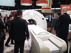 CTの展示コーナーでは,今回,最新の逐次近似画像再構成法である“FIRST”を搭載した「Aquilion ONE/ViSION FIRST Edition」を米国で初披露した。併せて,16列32スライスCTの上位機種に位置づけられる「Aquilion Lightning」もRSNAに初お目見えした。