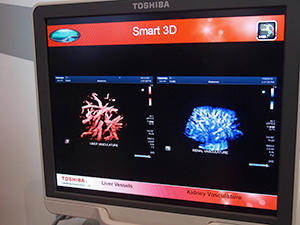 今回のRSNA2015では,SMIのアプリケーションとして,2015年10月から発売を開始した“Smart 3D”のデモンストレーションを行った。従来のSMIは,Bモードでの断面画像であったが,Smart 3Dでは3D画像で立体的に血流を評価できるようになった。腹部だけでなく,乳腺や甲状腺,上肢・下肢などの幅広い検査に利用できる。