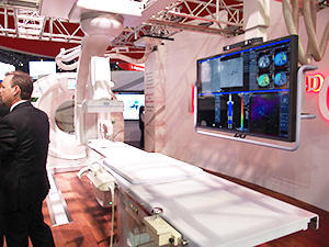Toshiba America Medical Systems(東芝)のブースの受付近くのメインステージに展示されたのが,米国初披露となるAngio CT「Infinix 4DCT」である。東芝は,RSNA2014においても80列160スライスCT「Aquilion PRIME」と「Infinix-i」(日本名:Infinix Celeve-i INFX-8000C)を組み合わせたInfinix 4DCTを展示したが,今回は「Aquilion ONE/ViSION Edition」と組み合わせたシステムを展示した。CTにAquilion ONE/ViSION Editionを用いることでパーフュージョン撮影も可能である。