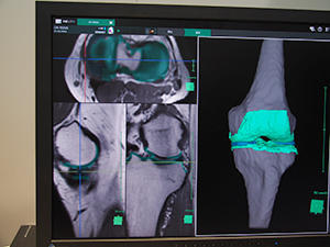 膝関節解析は,変形性膝関節症の診断・治療をサポートする機能で,3T MRIで撮像した膝関節のデータから,軟骨,半月板,頸骨,大腿骨を画像認識技術で自動的に抽出し,軟骨・半月板の厚みの自動計測や軟骨欠損率の評価,半月板の形状評価が行える。