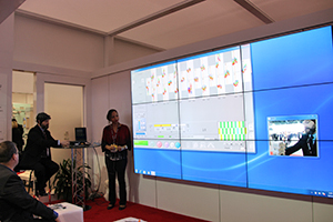 ブース中央のプレゼンテーションステージでは,X線システムの製品・技術紹介や,イェール大学と共同研究開発を行っているNIRS脳計測装置のライブデモンストレーションといったプログラムが行われた。