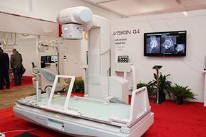 X線透視装置は,「SONIALVISION G4」をPRした。高画質を維持しながら被ばく低減を図る画像処理技術 “SUREengine” が改良され,通常のパルス透視よりも線量を約60%低減して高画質な透視撮影をすることが可能となる。さらに,透視撮影のパルスを半分にすることで,いっそうの被ばく低減を図ることができ,併用することにより従来のパルス透視線量の約20%程度まで低下が見込める。また今回,米国向けの製品として,テーブルに取り付けらえる小型のX線遮蔽補助具も紹介した。米国では,医師が近接で透視撮影操作をすることが多いため,テーブルサイドからのサポートや手技をできるだけ妨げることなく,X線を遮蔽できるこのような補助具へのニーズは高い。