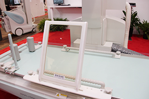 血管撮影装置は今回のRSNA 2016で,床置き式の「Trinias F12」を開発中のチルトテーブル(FDA,日本国内薬機法未承認)と組み合わせてアピールした。TriniasのCアームはフレキシブルな設計となっており,12インチFPDとあわせて全身領域の血管撮影をカバーすることができる。ハードウエアとアプリケーションの両面から高画質と低被ばくを追求した上位システムとして,日本と欧米をメインターゲットに展開している。併せて展示したチルトテーブルは,欧米で広く行われているCO2イメージングの効率的な実施を支援する。また今回,米国向け製品として,橈骨からアクセスする際に上腕を固定するアーム補助具をチルト寝台に備え付けて展示した。