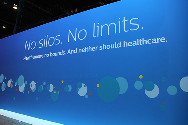 Philips(フィリップス)は,垣根を越えて,シームレスにつながるという考え方を示した“No Silos. No Limits.”を展示テーマに掲げた。Philipsは,デジタル化を進めることで“一連のヘルスケアプロセス”におけるイノベーションのさらなる加速に取り組んでおり,日本では2017年10月に社名を「フィリップス・ジャパン」へと変更し,新たな企業価値の創造に向けた施策を展開させている。今回の展示では,デジタル技術を活用してさまざまなデータをつなぎベネフィットを生み出すという方針を表現すべく,背骨のようにHealthcare Informatics/Performance Servicesセクションを置き,その周囲に各モダリティを配置するブースデザインで来場者を迎えた。