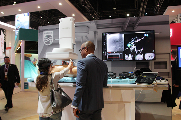 また,将来的な医療支援の一つの形として,Augmented Reality(AR)を用いたソリューションを参考展示した。ゴーグル型デバイスを通してナビゲーション画像などのデータを空間に表示したり,仮想的なモジュールでどこからでも装置の操作ができるといった,ARによる医療支援の可能性を紹介した。ノースビルディングに設けられたMachine Learning Showcaseにも出展し,AIやARなど注目の技術を活用した,フィリップスの考える未来の医療の形を来場者に提案した。