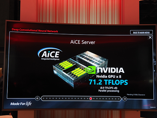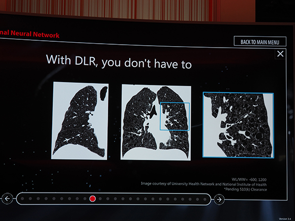 同社は,これまでCTの画像再構成技術について,FBPからハイブリッドIR法のAIDR 3D,MBIRのFIRSTと,一貫して画質の改善,向上のための技術開発に取り組んできた。AiCEは,その技術の蓄積があるからこそ,ディープラーニングの技術をいち早く臨床応用できたと言えるだろう。ブースでは,AiCEの技術概要の説明や臨床画像をプレゼンテーションするコーナーを設けて来場者にPRした。AiCEのサーバには,エヌビディアのGPUが8枚搭載され,71.2TFLOPS(IBM Watsonが80TFLOPS)という高い性能を持っていることを紹介した。