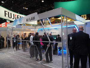 今回のRSNA2018のブースでは,“AI LAB”のコーナーを設けて富士フイルムの画像診断領域におけるAI活用の現状をアピールしたほか,画像診断のワークフローの中でAI技術をどのように生かすか,同社のPACS「SYNAPSE 5」の環境をベースに具体的な説明を行った。