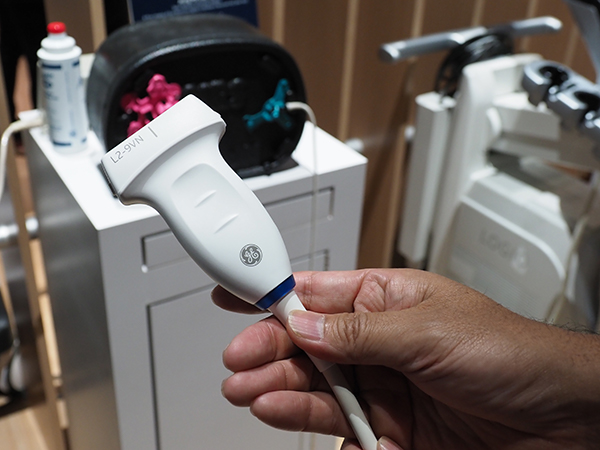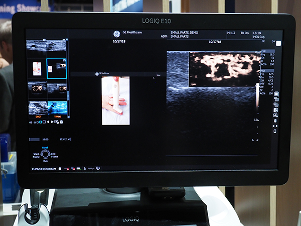 GE Healthcare(GEヘルスケア)のUSのコーナーでは,「LOGIQ」シリーズ最上位機種の「LOGIQ E10」が,RSNA初展示として,来場者に披露された。NVIDIA社製の高性能GPUを搭載し,従来ハードウエアを介して行っていたデータの送受信をソフトウエア上ですべて行う新しいイメージフォーマー技術“cSound”を採用した。cSoundは,多方向からのデータを高速かつリアルタイムに演算処理する。これにより,ピクセルレベルで全深度・全視野の焦点を合わせ,近位部の画質向上と深部までの均一な画質を高フレームレートで得られる。Bモード画像の画質向上はもちろん,微細な血流をとらえて画像化する“B-Flow”の基本性能が向上。CFM,PDIといった血流イメージング機能でも,空間分解能とフレームレート,感度を高めている。また,cSoundは,“Shear Wave Elastography”の高速化にも寄与している。これらの撮像データはraw dataで保存できるため,過去画像との比較などの場合にスキャンパラメータを調整して表示することが可能である。さらに,プローブには,電気信号と音の変換効率に優れたシングルクリスタル採用によって深部から浅部まで高画質を実現する「XDclear」が組み合わされる。LOGIQ E10に合わせて下肢血管などの描出に優れるリニアプローブ「L2-9-D」が新たに開発されている。