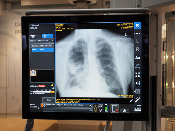 一般的に,移動型X線撮影装置の検査では,担当技師は短時間で多くの撮影を行わなければならない。特に,救急での検査オーダも多く,被検者の状態も重篤な場合もあり,正確な撮影と速やかな読影が重要なカギを握る。そこで,Critical Care Suiteでは,撮影直後に気胸の有無を判定して,気胸の確信度などの判定結果を示すことで,速やかな治療への移行を支援する。気胸の判定のほかにも,ポジショニングに問題があった場合はアラートを出すため,診療放射線技師の教育にも役立てることができる。