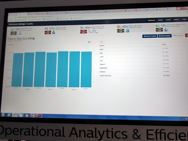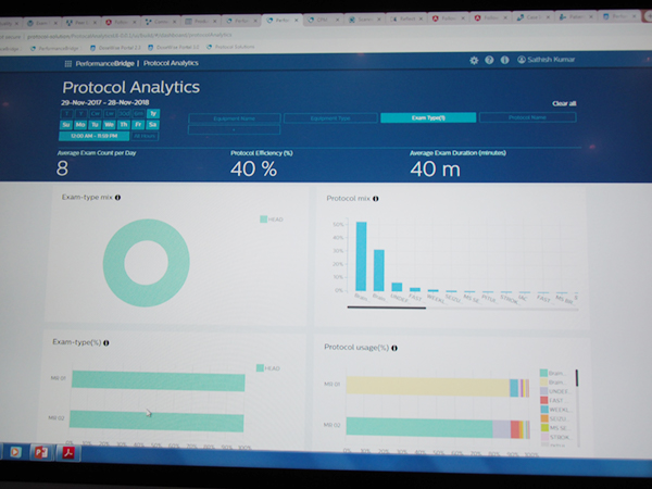 Philips(フィリップス)は,モダリティやサービスの種類を横断して専門領域ごとにRadiology Solutions,Cardiology Solutions,Oncology Solutionsの3つのソリューション体制を敷いており,今回,Radiology Solutionsの最新のサービスとして「PerformanceBridge」(日本未展開)をアピールした。PerformanceBridgeは,RIS,電子カルテと連携し,検査数や内容,時間,モダリティの稼働状況などの情報を集約して,ダッシュボードに数字やグラフで表示する。医療機関は,そのデータを基に自院の状況を把握・分析することで,業務の効率的な運営方法の検討や改善点の洗い出しなどを行い,放射線科のパフォーマンス向上につなげることができる。