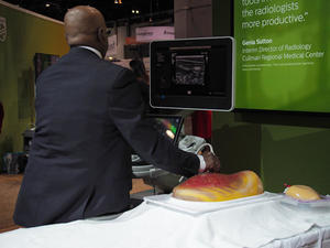 Philips(フィリップス)のUSコーナーでは,日本国内でも2018年3月に発売されたブレスト領域のソリューション「AI Breast」を,デモンストレーションを行ってPRした。AI Breastは,「テーブルトップ型フィールドジェネレーター」を寝台下に配置し,電磁トラッキングコイルを内蔵した「eL18-4 PureWave トランスジューサ」で乳腺をスキャンすることで,磁気を利用したトラッキングデータからプローブ位置を把握,記録することができる。モニタに表示されるボディマークには走査した部位がマーキングされ,スキャン残しを防ぐ。取り込んだ画像は位置情報とともに記録されることから,後から見返すときにも,どの部分の画像であるかを把握しやすい。また,乳頭から腫瘤までの距離と場所(時計軸方向)を自動計測・記録する“Auto Annotate”機能が実装され,スキャンから計測,記録までの一連の検査時間を短縮できる。これらの機能により,乳房超音波検査の質の標準化や検査効率向上が期待でき,高濃度乳房が多い日本人の乳がんスクリーニングにおいても力を発揮すると期待される。