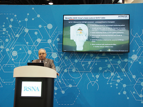 日本国内では2018年にリリースされた64列マルチスライスCT「SCENARIA View」が,2019年9月にFDAを取得。モックアップの展示と併せて,最新アップデートが紹介された。今回,South Hall内に各社が新製品プレゼンテーションを行うRSNA企画「Innovation Theater」が設けられ,日立はここで初日(12月1日)にSCENARIA Viewの紹介を行った。