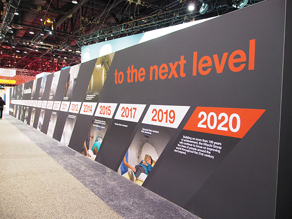 Hitachi Healthcare(日立製作所)は今回,South Hallにブースを出展した。ブースデザインを一新し,全体の基調色を黒とすることで,モダリティの白を際立たせるような工夫が施されている。ブース上部には大型LEDディスプレイを掲げ,コーポレートサインを展開することで,通路を行き交う参加者にも大きくアピールした。