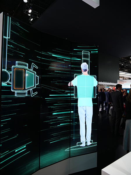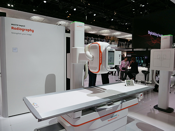 ほかにも会場内には,一般撮影装置「MULTIX Impact」(薬機法未承認)を展示した。X線管球側にカメラが取り付けられ,被検者の動きを確認しながら撮影できる。このカメラをさらに応用して,将来的には,被検者の位置を自動認識し自動で最適なポジショニングができるような技術をめざす。会場内に設けられたFuture of X-rayコーナーでは,胸部,膝,長尺撮影でのイメージを紹介した。