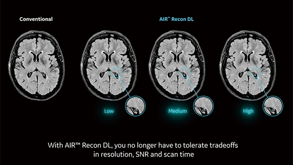 さらに,MRIでもディープラーニングを用いた画像再構成技術である“AIR Recon DL”(国内未販売)を紹介した。raw dataにアルゴリスムを適用することで大幅な画質向上を実現した。