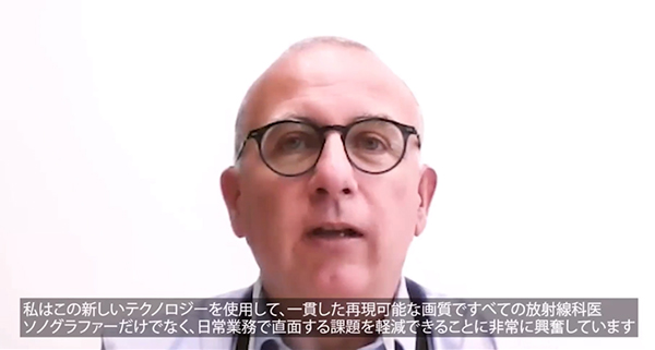 イベントでは,DeepInsightの開発者である同社の石原千鶴枝氏が,DeepInsightにおけるAIの活用や開発の課題と解決,DeepInsightが超音波画像にもたらすメリットについて説明した。次いで,フランスのNecker University Hospital & Paris Centre Medical Universityの放射線科教授であるJean-Michel Correas氏がメッセージを寄せ,超音波画像のあり方についてコメントした。Correas氏は,超音波は診断に加えて穿刺やアブレーションのガイドにも使用することから,合併症を回避するためにBモードが重要な役割を果たすこと,また,被検者や検査者に依存するため画像の調整が課題であることを指摘。これらに対して,AI技術を活用したDeepInsightが役立つことに期待を示した。