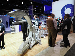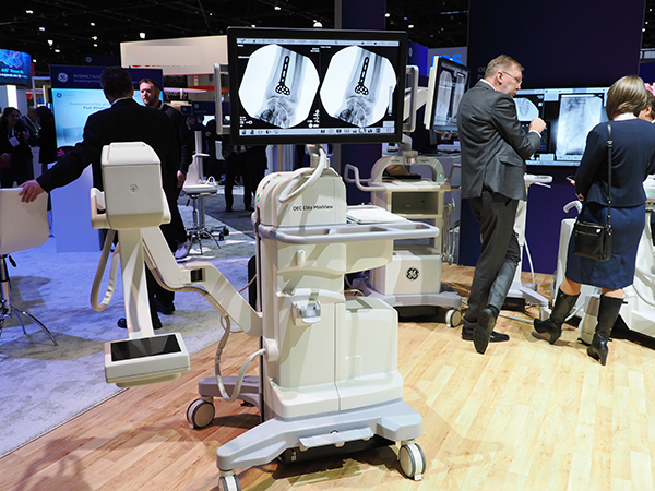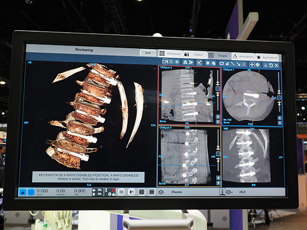 GEヘルスケアは今回,外科用CアームX線撮影装置「OEC」シリーズにおいて,システムのバージョンアップを行い,ラインアップを強化したことをアナウンスした。ブース内に設置された「OEC 3D」は,すでに日本国内でもユーザーを増やしているが,今回は最大の特長であるコーンビームCT機能を強化し,利便性が向上したほか,適用領域を拡大した。従来,脊椎の手術支援をターゲットとしていたが,新たに肺生検に適した3D画像表示機能を追加し,2D撮影においてもCO2造影に対応するなどの機能強化が図られた。これにより,より多くの診療科や領域でモバイルCアームによる3Dおよび2D画像を撮影できる。日本国内では今後のバージョンアップに対応する。