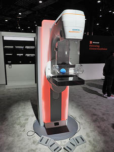 Siemens Healthineers(シーメンス)のX線関連では,フルデジタルマンモグラフィ「MAMMOMAT Revelation」を紹介した。マンモグラフィのラインアップの中では,最上位機種となる。振り角は±25°(トータル50°)のワイドアングルでのトモシンセシスに対応する。さらに,トモシンセシス画像を用いるトモバイオプシー機能「HD Tomo Biopsy」をオプションで提供する。通常のバイオプシーよりもターゲットの選択が容易で,手技時間の短縮も可能である。