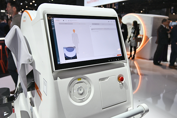 この3機種に加えて,コンパクトなモバイルCT「SOMATOM On.site」(薬機法未承認)も展示した。2019年のRSNAで披露された装置の第2世代となる。32スライスの頭部専用装置で,ICUなど被検者の移動が困難な場合に,ベッドサイドで撮影が行える。重量は900kgとなっているが,ハンドルを握るとモーターがアシストして容易に移動可能だ。さらに,テレスコピックモードを採用してガントリのみを動かすことで揺れを抑え,据え置き型のCTと同等に画質を実現している。