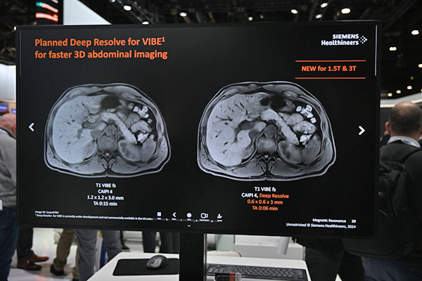 Siemens Healthineers(シーメンス)のMRI展示エリアでは,PET/MRIの「BIOGRAPH One」(薬機法未承認)1.5T装置「MAGNETOM Flow」の2機種を展示した。BIOGRAPH Oneは,2010年のRSNAで発表された「Biograph mMR」の後継機種となる第2世代のPET/MRI。MRIにはシーメンスの研究用ハイエンド3T装置である「MAGNETOM Vida」を採用。PETには「Biograph Vision」の半導体検出器をPET/MRI用に再設計し,250ピコ秒以下のTOF時間分解能を実現。従来機種よりも大幅に収拾時間を短縮できる。MRIもディープラーニングを用いて高画質化,撮像時間の短縮化を図る画像再構成技術「Deep Resolve」を採用しており,30分以内で検査が可能。FOVは従来の装置よりも拡大し,35cmとなっている。MAGNETOM Vidaに搭載された「BioMatrix Technology」も採用しており,呼吸同期などのセンサのBioMatrix Sensorsが利用できる。さらに,幅90cmのブランケット型コイル「BioMatrix Contour XL coils」を2つ寝台にセットすることで全身の撮像にも対応する。