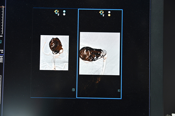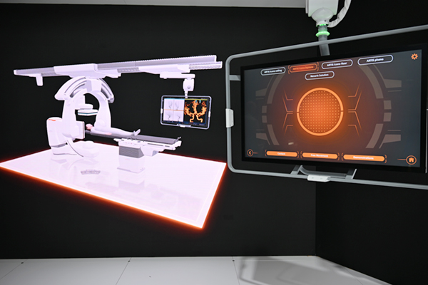 一方,血管撮影装置は,大型のタッチパネルを操作すると壁面全体のディスプレイに「ARTIS icono biplane」などの装置が表示されて,タッチパネル操作で上下・左右,拡大・縮小操作を行え,実際の操作環境を理解しやすくした。さらに,新しいアプリケーションとして,ARTIS icono biplaneに搭載される3Dロードマップ機能のデモンストレーションも実施した。3Dロードマップは,3D画像を透視画像上にオーバーレイして表示する。従来は正面像だけであったが,側面像にも対応し,脳血管内治療での手技を支援し,安全性と精度の向上に貢献する。