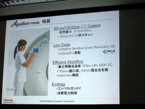 東芝メディカルシステムズ(株)は2013年4月3日(水),東京国際フォーラム(東京都千代田区)において,新製品発表会を開催し,同社マルチスライスCTの最上位機種である「Aquilion PRIME」のフルモデルチェンジを発表した。