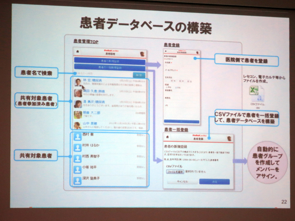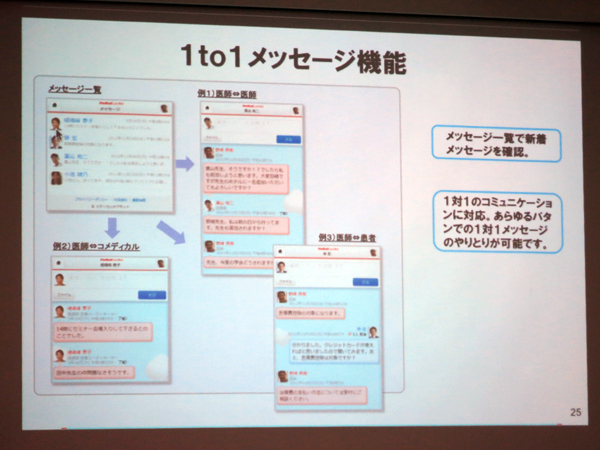 メディカルケアステーションを立ち上げたのは,同社のほかJRCエンジニアリング(株)と(株)日本エンブレースの3社。ユーザーを医療・介護関係者に限定し,各種職種間に加え,患者・家族も参加できる2種類のタイムライン表示機能を持つ。このほか,基本機能として患者管理や,1to1メッセージ,患者ノート,関係者招待,ファイル添付なども利用できる。また,このSNSと,共通API(Application Programming Interface)で開発された電子カルテやレセコン,PACSなどのパートナーが提供するアプリケーションを連携させることも可能。ユーザーは,統合アプリケーションのようにシームレスに使用できるという。利用にあたっては,完全非公開型SNSのため,登録または招待が必要となる。SNS管理者は,患者や利用者ごとに連携するメンバーを招待し,グループを管理。これにより,セキュアな環境下で,タイムライン表示などによる情報の共有が容易になり,スムーズな多職種連携を実現する。