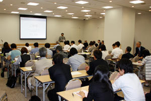 冒頭,同社代表取締役社長の河上正三氏の挨拶に続いて,ギブン・イメージング社CEOのホミ・シャミール氏が大腸がん早期発見のための取り組みについて説明した。