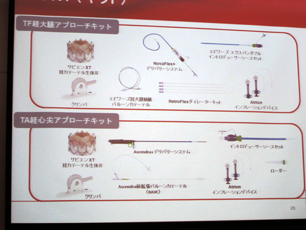 サピエンXTは,重度の大動脈弁狭窄症患者の中でも開胸での大動脈弁置換術の適応とならない高齢者などの患者に対し施行するTAVI用のデバイス。経太腿(TF)と経心尖(TA)の2つのアプローチに対応したキットを用意。このキットには,生体弁のほか,バルーンカテーテル,デリバリシステム,クリンパなどが組み合わされている。保険償還価格は453万円(迅速導入評価額を除いた償還価格は431万円)としている。
