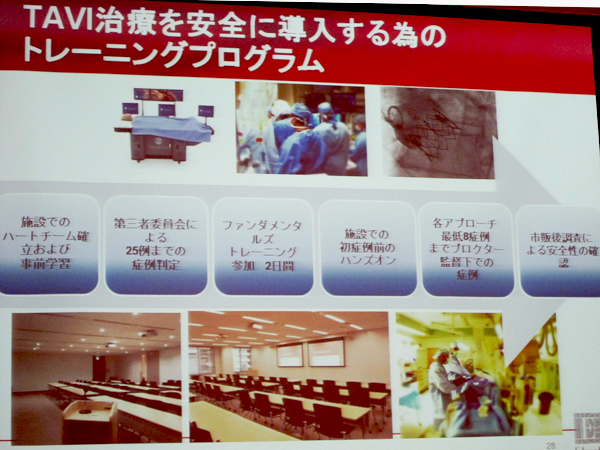 続いて,同社のデバイスを用いたTAVIの施行経験を持つ慶應義塾大学病院循環器内科の林田健太郎氏が,「経カテーテル大動脈弁治療(TAVI)—日本での本格導入に向けて—」をテーマに講演した。林田氏は,大動脈弁狭窄症の患者の多くが開胸手術の不適応である状況を説明した上で,TAVIの手技やデバイス選択のデシジョンツリーを解説した。また,自身が留学したフランスのInstitut Cardiovasculaire Paris Sud(ICPS)でのTAVIの経験について触れたほか,合併症のリスク,弁輪サイズの正確な計測などを取り上げ,日本人症例の特徴を理解し,安全性を確立することが重要だと述べた。さらに林田氏は,TAVI適応患者の要件と不適応の場合の治療法を紹介した上で,早期診断が大事であると言及。そして,わが国におけるTAVIの普及に向け,施行の判定にかかわるScreening proctor,施設や術者間での経験の共有,日本人proctorの育成,proctor間の情報共有がカギになると説明した。