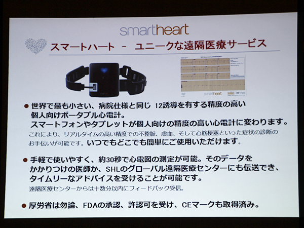スマートハートは、イスラエルのSHL Telemedicine社が開発した世界最小の個人用ポータブル心電計で、病院などで使用されている心電計と同様の12誘導の精度の高い心電図が計測できる。さらに,iPhoneなどのスマートデバイスと接続して計測した心電図データの管理やデータを転送して専門家のアドバイスを受けられるのが特徴だ。スマートハートは,ホルター心電図のように継続的な計測を行うのではなく、定期的な測定や症状を感じたときに簡単に精度の高い計測ができる装置だ。医療機器として薬事認証(クラスⅡ)を受けているほか,FDAおよびCEマークも取得済みで,ワールドワイドでは10万人のアクティブユーザーがいるという。