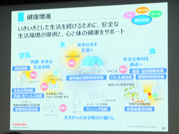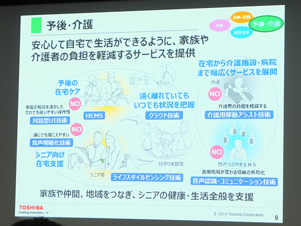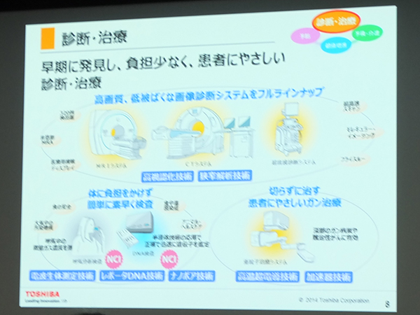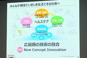 東芝は昨2013年に策定した中期経営計画において,「エネルギー」「ストレージ」とともに「ヘルスケア」の3分野を事業の中核に据え,スマートコミュニティを実現することとした。その中でヘルスケア事業は,「より快適に,より安心に,より幸せに」という価値観を基に,「みんなが健康でいきいき生活できる社会」に向けて取り組んでいく。そのために東芝では,予防,診断・治療,予後・介護,健康増進の4分野で広範囲の技術融合を図るとしている。田中社長は,これにより「異次元ヘルスケア」を創造すると説明した。