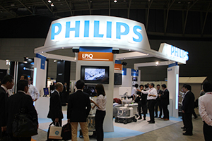 フィリップスエレクトロニクスジャパンは,新たに腹部系のアプリケーションを搭載した新モデルの「EPIQ 7G」が追加された,最上位機種のプレミアム超音波診断装置である「EPIQシリーズ」を展示のメインに据えてブースを構成した。ブースでは,EPIQ 7Gの登場に合わせてバージョン1.2となった最新のソフトウエアについて,多くの実機での説明と,模擬患者を使った“ライブデモンストレーション”を行って来場者にアピールした。EPIQは,新たに開発したビームフォーミング技術であるnSIGHT(エンサイト)テクノロジーによって時間分解能,空間分解能と組織透過率を両立させ高画質を実現しているほか,デザインや静粛性の高さなどを使用環境に改善する機能を搭載する。EPIQ 7Gでは,組織の硬さを計測するShear Wave Elastographyである“ElastPQ”,CT,MRIなどの画像とフュージョンして,穿刺などの手技をサポートする“PercuNav”が搭載された。また,ライブデモでは,新しい小型高周波プローブの“C9-2”による高画質によって肝臓疾患の造影超音波やエラストグラフィに対応できることや,縦横に9212素子を配列したxMATRIXトランスデューサによる4Dイメージングが可能なことを紹介した。
