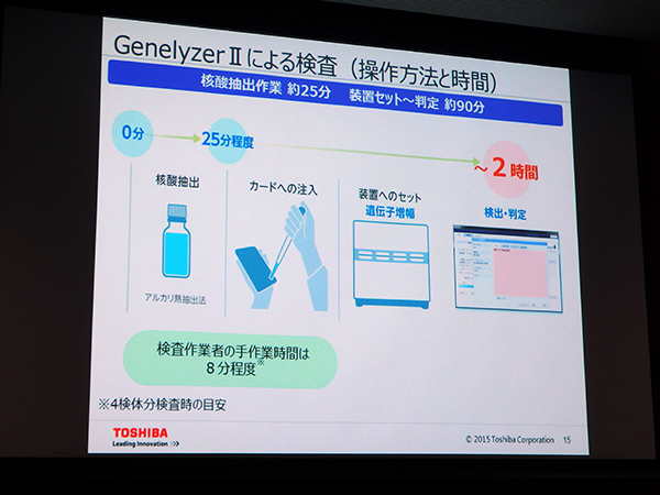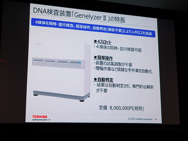 DNA検査システムの発売にあたり,同日には同社スマートコミュニティセンター(神奈川県川崎市)で記者発表会が開かれた。ヘルスケア社の綱川 智社長とDNA検査システム事業開発部の後藤浩朗部長,川崎市の福田紀彦市長,川崎市健康安全研究所の岡部信彦所長が出席。来賓として挨拶した福田市長は,地元企業との共同研究の成果であることを強調した。また,綱川社長は,同社が力を入れているヘルスケア事業における期待の新製品であると説明。食の安全・安心を実現するための衛生管理に貢献する製品としてアピールしていた。今後は,国内だけではなく,海外での展開も予定しているという。