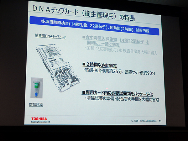 また,今回発表された衛生管理用検査キットは,同社独自の電流検出型DNAチップを採用したカード内に必要試薬類をパッケージ化することで,試薬の準備・配合の手間を省力化。操作性の向上に加え,ヒューマンエラーや結果のバラツキを抑える。従来は,4,5日かかっていた検査期間を大幅に短縮する。
