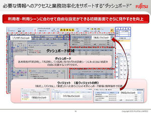 1) “使いたくなる”システムでは,診療シーンに合わせてカルテ画面を自由に構成できる“ダッシュボード”と,病名やバイタル,薬歴など必要な項目ごとにパーツ化した“ウィジェット”によって使いやすさや業務効率を向上する。そのほか,Webのような検索などを実現する診療記録のテキストマイニング,シングルサインオンの実現,タブレットやメッセンジャーなど汎用的技術を使ったワークスタイルへの転換などが挙げられる。