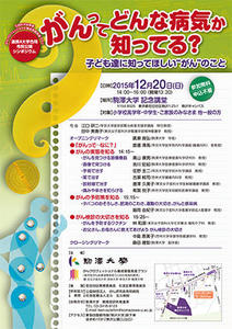 2015年12月20日(日)14時より,この連携4大学によるがんプロのイベントとして,小学生・中学生とその家族など,一般の方達を対象にした市民公 開シンポジウム「がんってどんな病気か知ってる? 子ども達に知ってほしい“がん”のこと」が駒澤大学記念講堂にて開催された。子ども達に,わが国の死因 第1位の疾患“がん”に対する正しい知識や,予防,検診の大切さを知ってもらうことを意図して企画された。