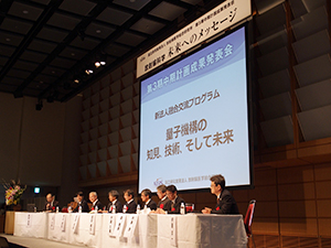 量子機構発足に向けたパネルディスカッション。写真左から,モデレータの原田氏,パネリストの上田氏,明石氏,田島氏,島田氏,伊藤久義氏,森氏,内海氏,オブザーバーの伊藤洋一氏。 |
