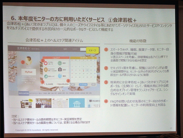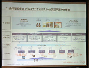 福島県会津若松市では,IoTを活用したヘルスケアプラットフォームの実証事業を開始した。2016年9月から市民のモニターを募集。約100名が参加して11月から本格的に始動した。11月4日(金)には,都市センターホテル(東京都千代田区)で記者説明会を開始し,事業の概要を発表した。