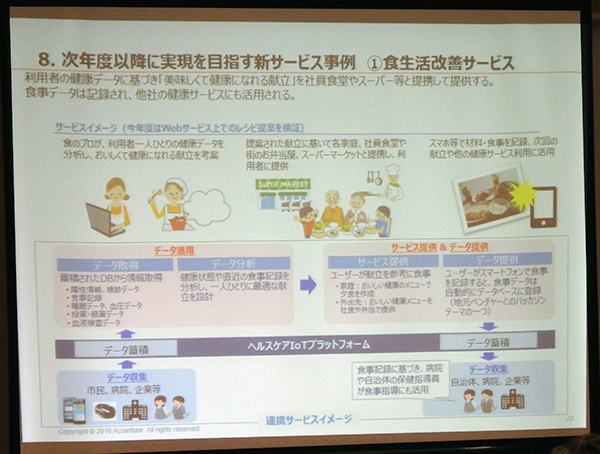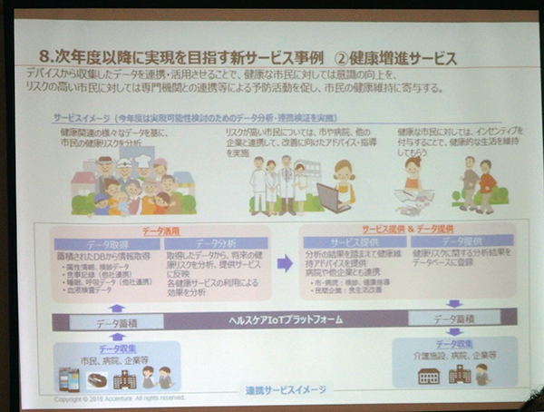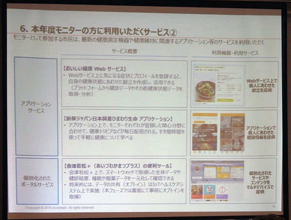 具体的な事業内容としては,「会津若松+」という市民向けポータルサービスを活用し,モニターとして参加する市民が,生体情報や睡眠,服薬といったデータを一元管理し,スマートフォンなどから参照できる。将来的には,利用者の承諾を得た上で,事業者間でデータの共有ができるようにして,さらに個別化したサービスの提供が可能になる。モニター市民は,ニーズに応じ,おいしい健康による献立作成などのWebサービスや,損保ジャパン日本興亜ひまわり生命保険の健康情報提供サービスを利用できる。サービスを受けるために,モニター市民には,スマートウォッチや睡眠モニタリング機器,薬箱センサーが用意される。これらのIoT機器を用いて,各種データが事業者側に取得され,個々の利用者に合ったサービスが提供される。次年度以降は,食生活改善サービス,健康増進サービスの展開を想定しており,2020年以降には全国展開をめざすという。また,本事業を通じて,IoT機器によるデータ取得・利用の仕組みの整備,データ相互活用の技術的実証,持続可能なビジネスモデルの確立,ステークホルダーの巻き込み,医療アナリティクスの人材育成を図るとしている。