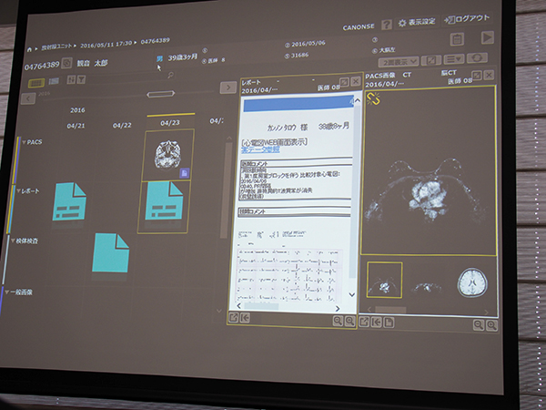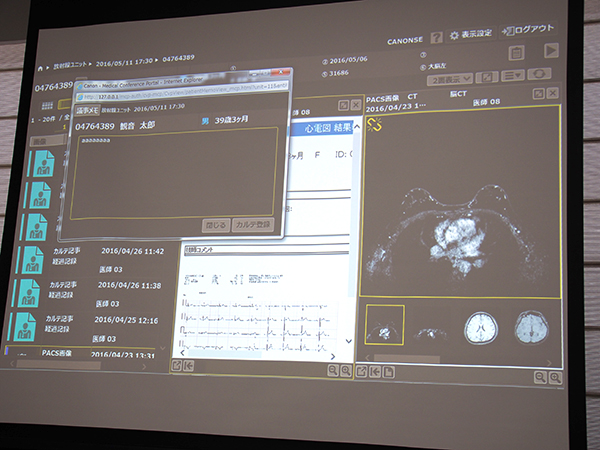 キヤノンマーケティングジャパングループのキヤノンITSメディカル(株)は,2016年11月16日(水)に京都大学医学部附属病院と共同開発した医療カンファレンス支援システム「メディカル カンファレンス ポータル」を発表した。同システムは,病院を対象に11月下旬から提供が開始される。発表に先立ち,9日には報道機関向けの内覧会がキヤノンマーケティングジャパン(株)品川本社(東京都港区)で行われた。内覧会では,第一事業部営業部部長の中村智生氏が,キヤノンマーケティングジャパングループの経営計画や同システムを開発した背景について述べた後,製品説明とデモンストレーションが行われた。