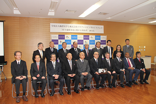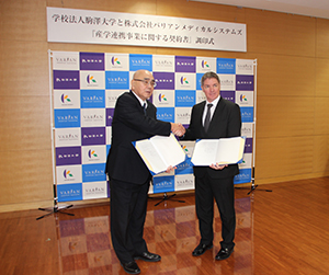 学校法人駒澤大学と(株)バリアンメディカルシステムズ(以下,バリアン社)は2016年11月28日(月),同大学駒沢キャンパス内に,日本初の試みとなる産学連携による放射線治療人材教育センターを設立することを発表し,産学連携事業を確認する契約書の調印式を開催した。