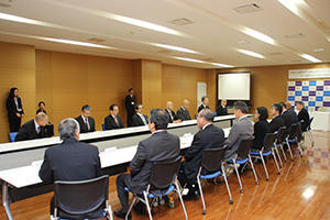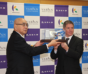 調印式には,同大学から理事長の須川法昭氏,学長の廣瀬良弘氏ら,バリアン社からは代表取締役(日本法人代表)のMitchell Silong氏,学術担当副社長のDeepak Khuntia氏,アジアパシフィック プレジデントのKevin O’Reilly氏らが列席。日本では,がんの罹患者数が増加の一途をたどる一方,放射線治療の実施率は欧米の約60%に対して30%弱と低い現状を鑑み,高水準な放射線治療を実施できる熟練の医療技術者を育成することは,患者のQOLの向上や日本はもとより世界の医療技術の進展に寄与するものであることが相互に確認された。その上で,須川理事長とMitchell Silong氏が契約書にサインし,固い握手が交わされた。また,バリアン社から記念品が贈呈された。