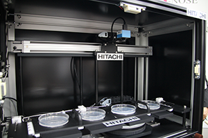 スクリーニング検査として実用化するには,現在は人の手で行っている検査を自動化する必要があるため,両社は,2015年より連携して検査の自動化技術の研究を進めてきた。線虫がん検査の工程は,1)線虫培養,2)線虫の回収・洗浄,3)尿検体・線虫の配置,4)化学走性試験,5)線虫計数,6)判定の段階に分けられるが,2)〜4)を自動分注システム,5)と6)については走性プレートを自動撮像・画像解析するシステムとして検査の自動化を図っている。判定のための画像解析では,線虫の計数は困難なため,走性プレートを撮像した画像をブロックに分割し,各ブロックの輝度(線虫が多い=高い)で定量評価を行う。また,連続撮像を行うことで線虫の移動度も評価することができ,これにより試験の品質管理も可能になっている。日立健康保険組合の協力などで行った自動解析システム試作機の試験では,手作業で試験を行う場合と同等の精度が認められた。