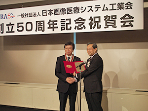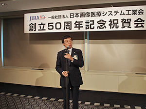 一般社団法人日本画像医療システム工業会(JIRA)は2017年6月8日(木),KKRホテル東京(東京都千代田区)において,創立50周年を祝う記念祝賀会を開催した。祝賀会には,小松研一会長はじめ,各理事や会員企業の代表者が参加。また,行政や学会,他工業会などから多くの来賓を迎えて,盛大な祝賀会となった。